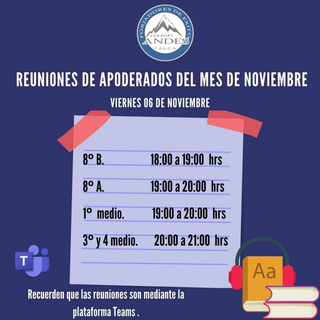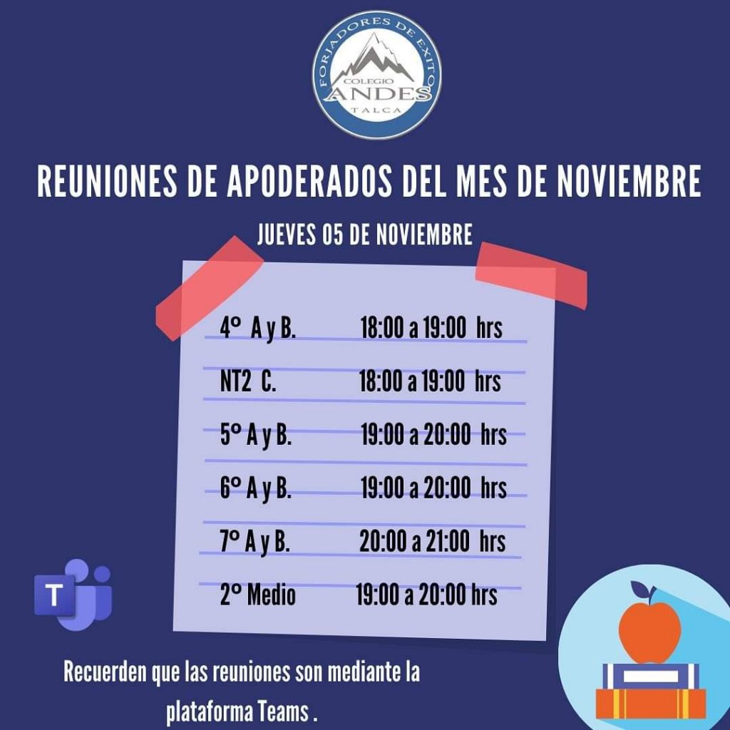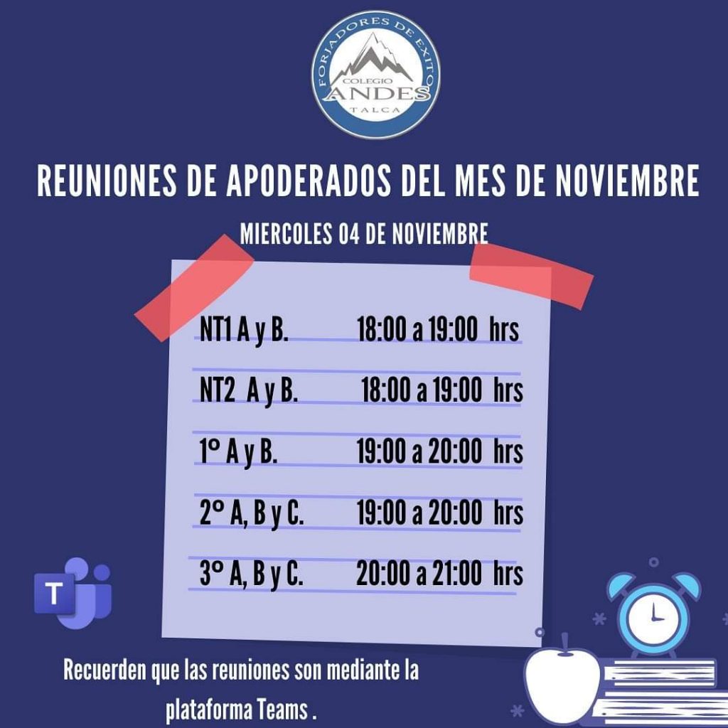 3 Nov, 2020 REUNIONES APODERADOS NOVIEMBRE Estimada Comunidad Les dejamos los horarios para las reuniones que se realizaran esta semana, todas por la plataforma TEAMS. Un cariñoso saludo para todos ustedes.